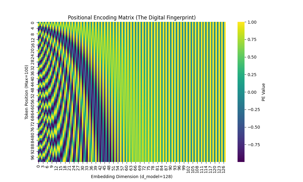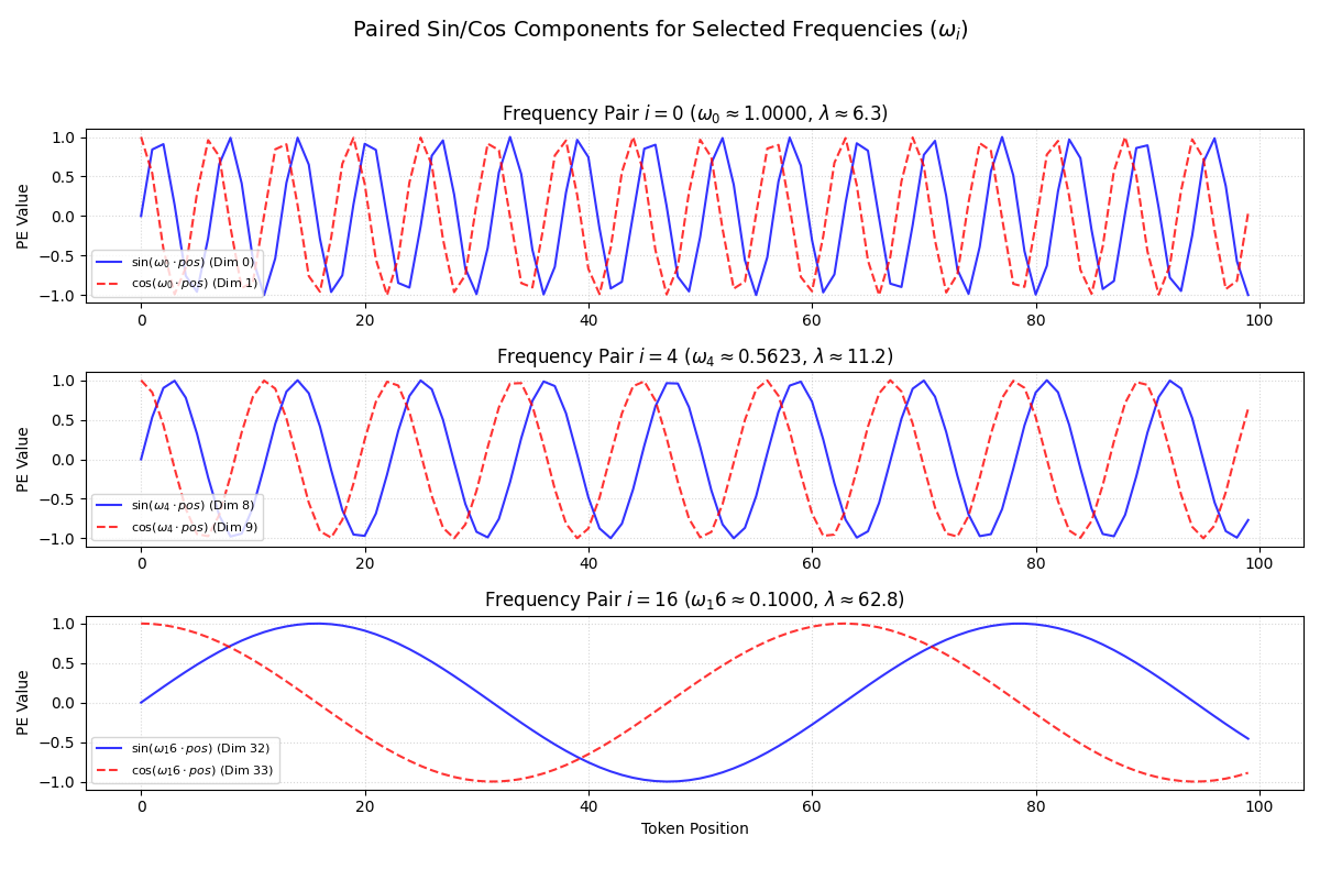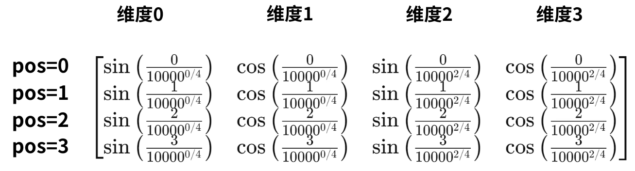 从上面这个二进制编码,如果竖着看,那么可以发现左边的频率小,右边的频率大,是周期性的。具有周期性,且能控制频率大小,函数值有界,可以无限延申。比较容易想到的就是三角函数,每一列赋予一个频率,那么就可以得到位置编码: