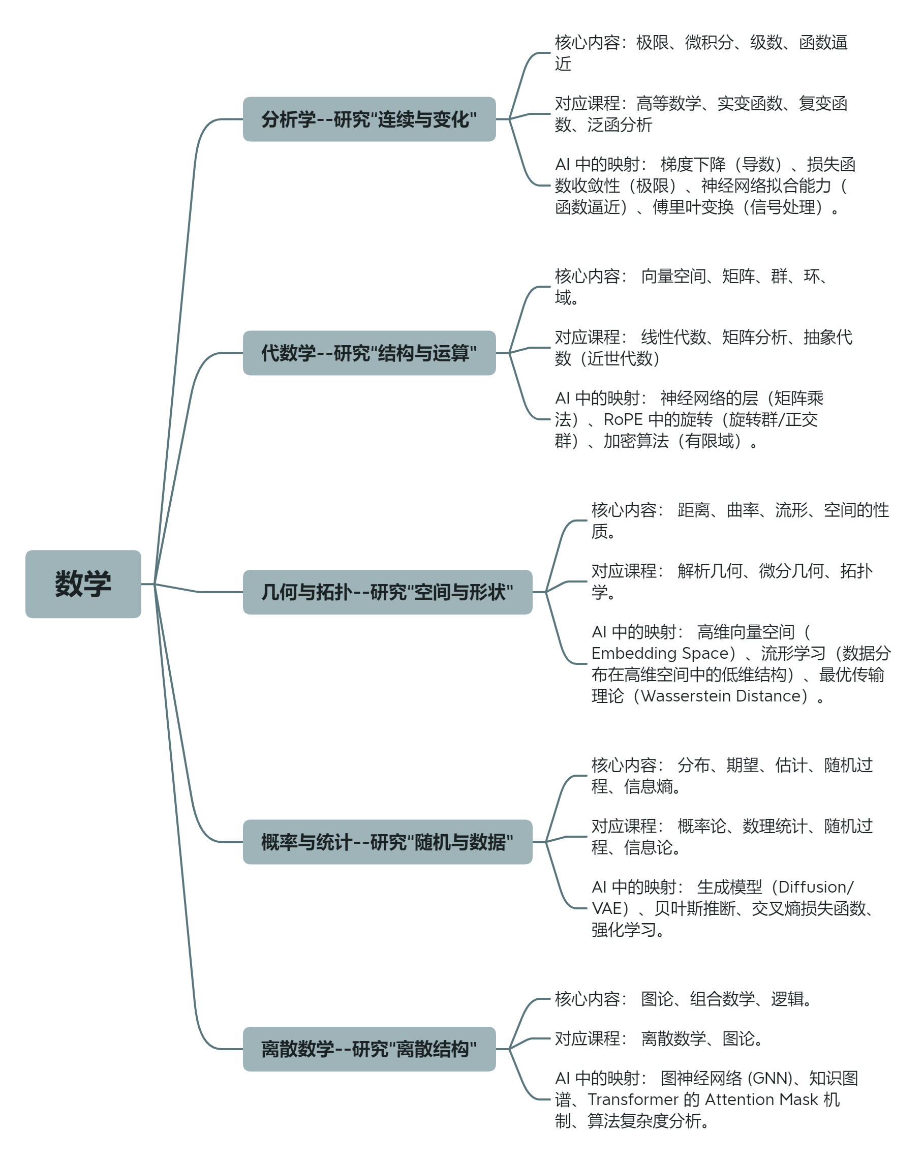 从现代数学的视角,我们可以把通过“处理对象”的不同,粗略分为五大板块: